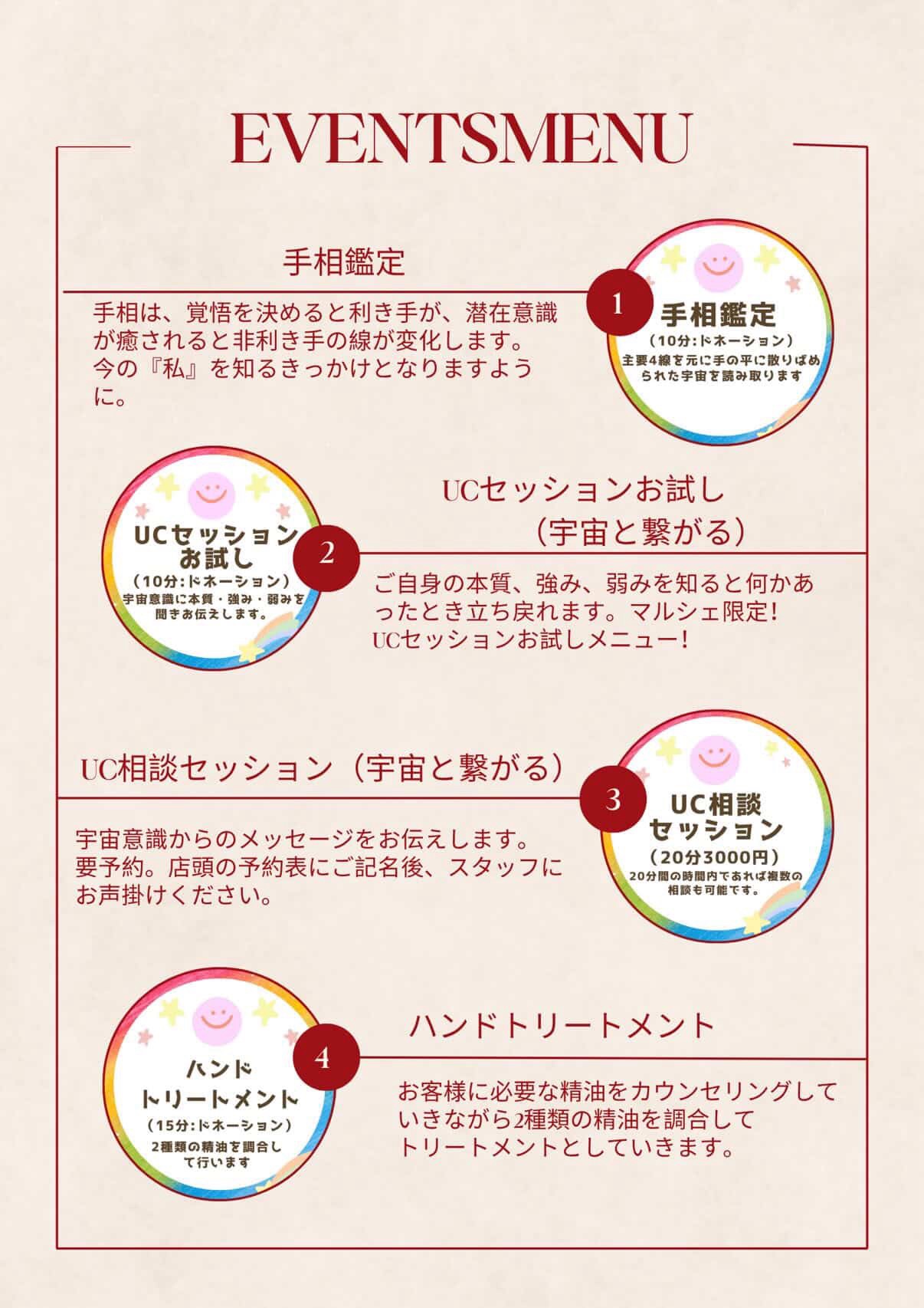 お客様に合わせて精油を調合するハンドトリートメント、手相鑑定&カウンセリング、手相以外での鑑定はオラクルカード、癒しのライアーチャクラヒーリングをご提供させていただきます。